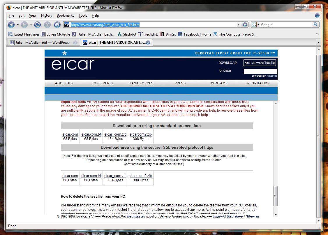 First off, I downloaded the eicar malware test file from here. It’s a file that’s detected by pretty much all anti-virus products out there.