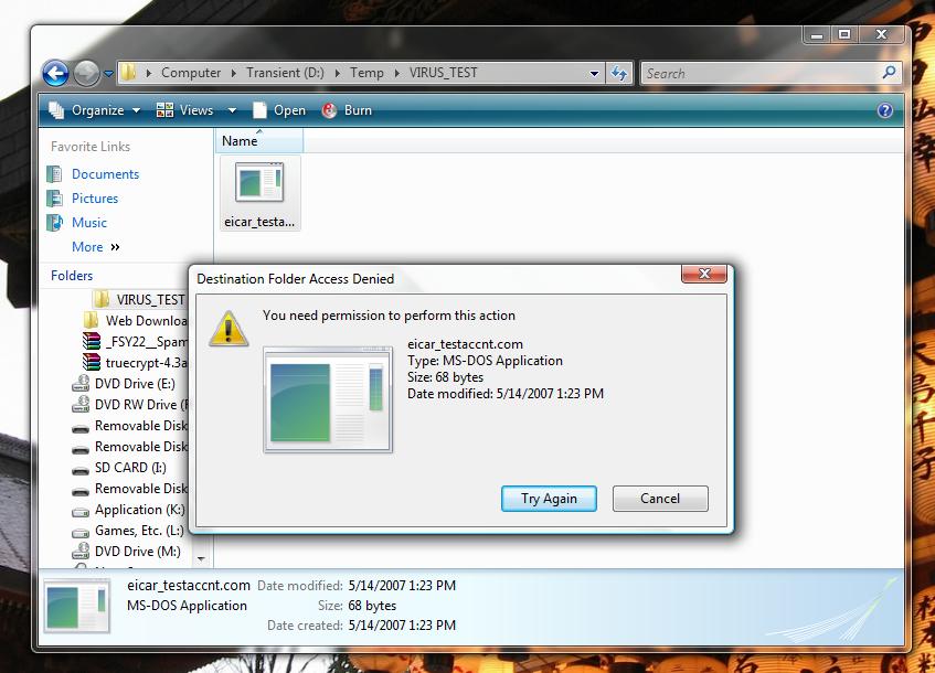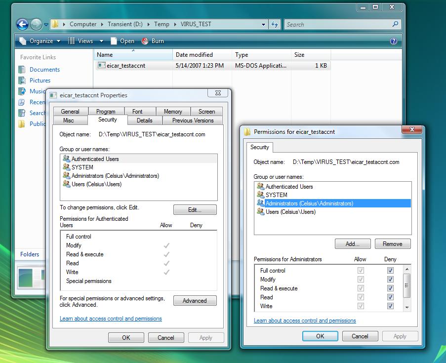Now running as the user testaccnt, I downloaded the eicar file again, only this time I used the permissions to deny access to all but my own account. This included denying access to the main Administrator account.