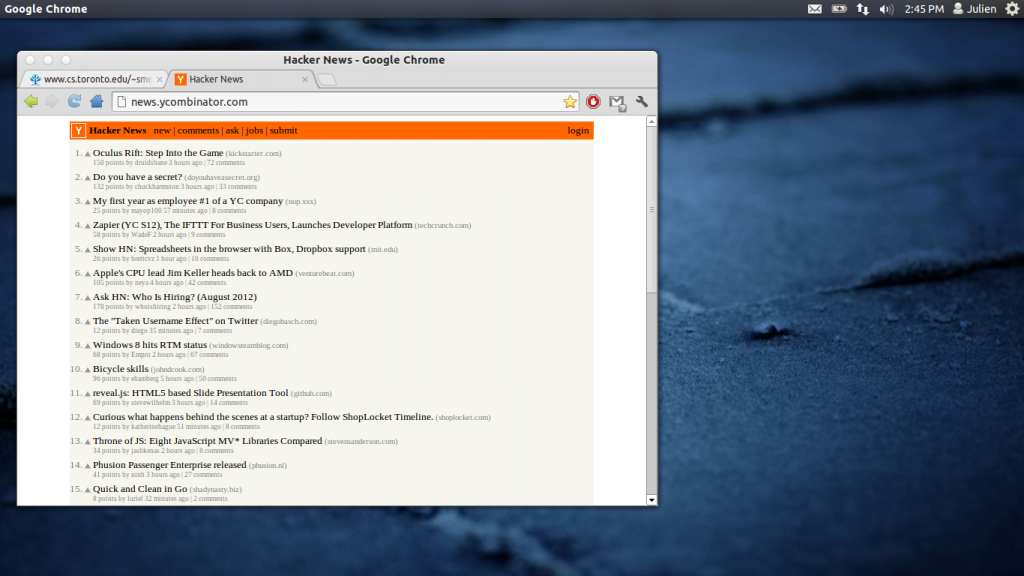 Unity: This has become much more usable since Ubuntu 11.10, and is the DE I have settled with for now. If the team at GNOME had a design goal of making things easy, Unity’s was to reclaim as much of the desktop for the content that mattered. The minimalist scrollbars, the window decorations that dissapear when maximized, the integration of the application menu into the top bar. These ideas took some getting used to, but I’ve come to appreciate them.