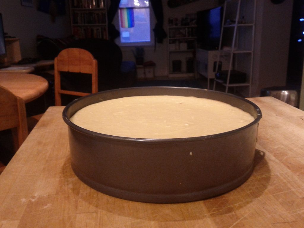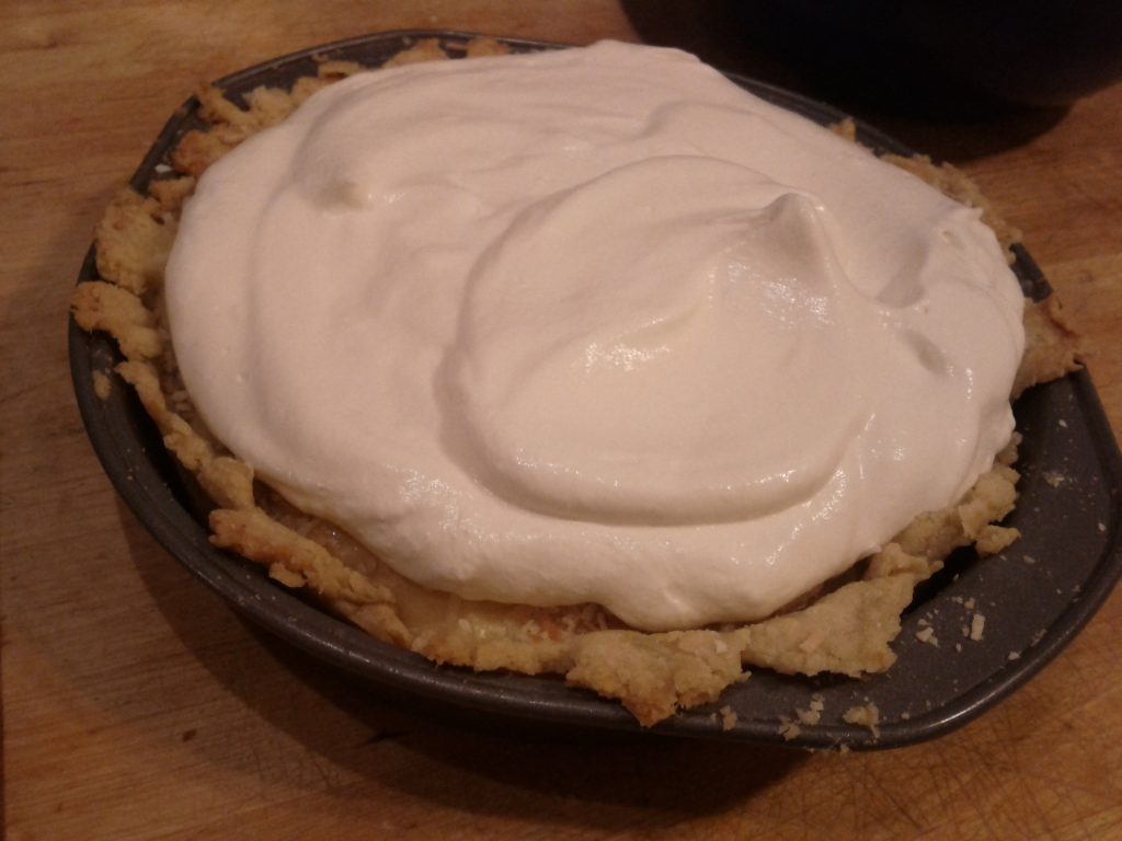 Which means I also made a cheesecake and coconut cream pie. Unfortunately, I screwed up the cheesecake. I included a water bath, which meant no more cracked top – but then it became extremely runny. I think next time I’ll include the water bath for 20 minutes of baking, then take it out.